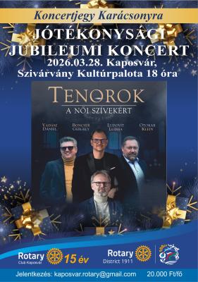 A koncerttel a Kaposvári Rotary Club 15 éves születésnapját ünnepeljük, valamint a Rotary Magyarország 100 éves születésnapjáról emlékezünk meg. Megkeztük a koncertjegyek értékesítését, melyet ajánlunk karácsonyi ajándékként nyújtani szeretteinknek, barátainknak, kollegáknak.
